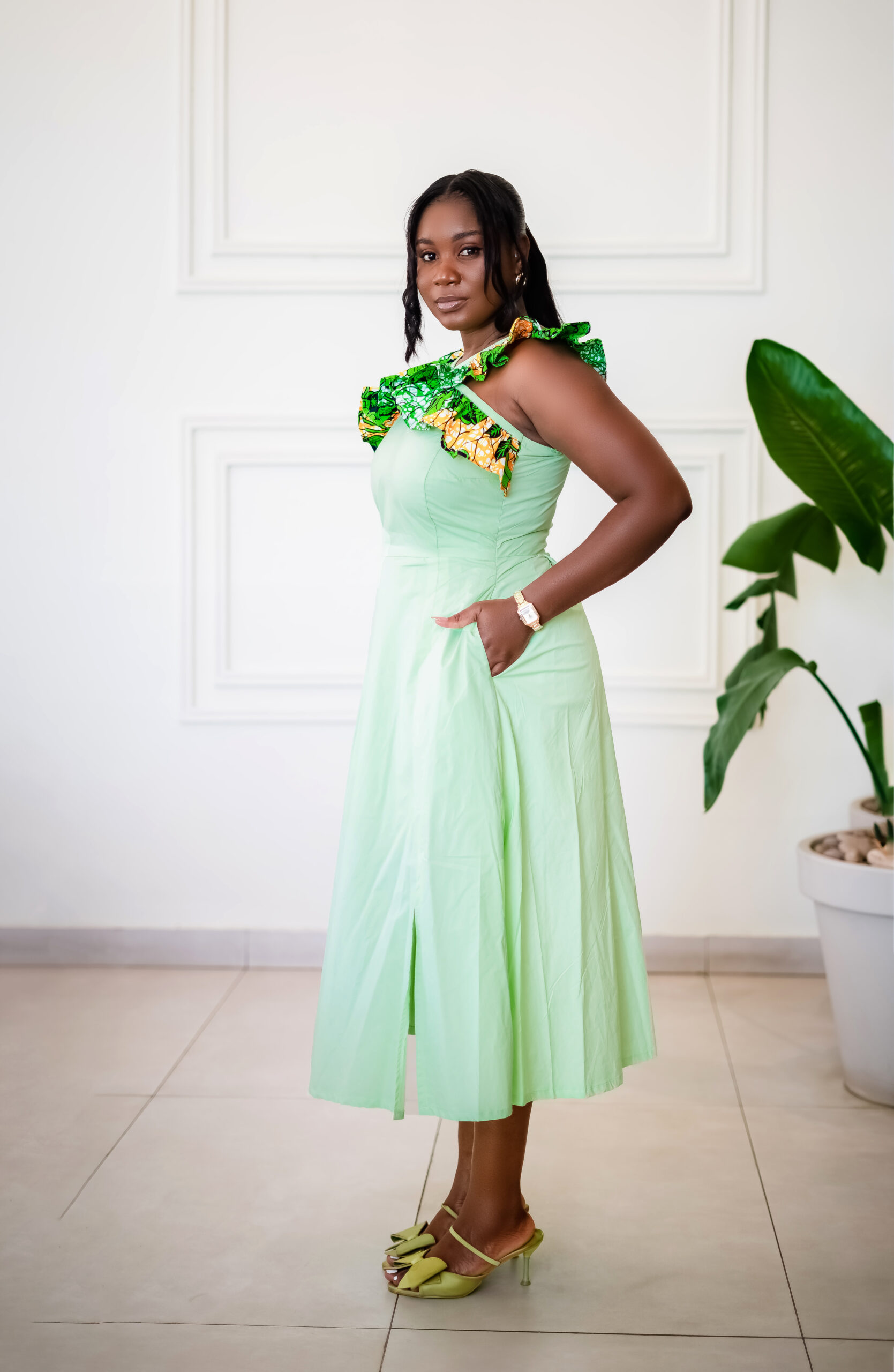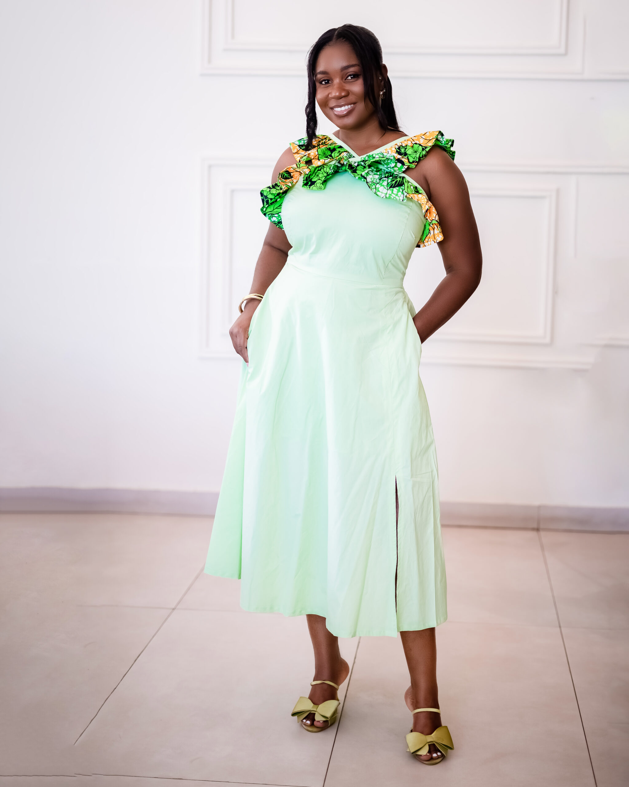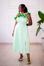 The Cherry Dress is your vibrant-girl moment, lemon green paired with rich African print to create a look that’s both refreshing and deeply rooted in culture.