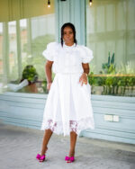 A crisp white skirt and top paired with subtle lace accents that add elegance without doing too much. It’s calm, classy, and perfect for effortless holiday slay